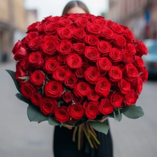 Этот великолепный букет из 101 красной розы - верх романтики и чувственности. Лепестки этих цветов отражают горячую искру страсти, а их аромат наполняет воздух неповторимым соблазнительным шлейфом. Этот букет способен растопить даже самое холодное сердце и подарить океан эмоций. Он выражает неповторимую красоту любви и сильные чувства, уносят в мир романтических мечтаний и желаний. Вечное восхищение в каждом бутоне, каждом лепестке. Это букет, который создает историю, погружает в океан счастья и оставляет незабываемые воспоминания.